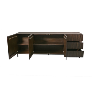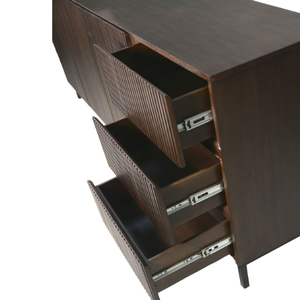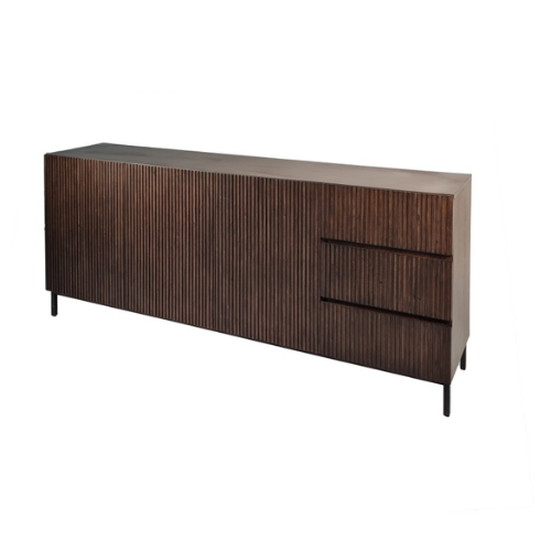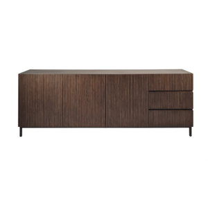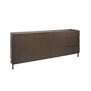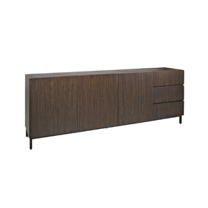 Le bahut Sevilla séduit par son design élégant et contemporain, avec sa façade rainurée en bois foncé et ses lignes épurées. Monté sur des pieds fins en métal, il offre un bel espace de rangement tout en apportant du caractère et du raffinement à votre intérieur.