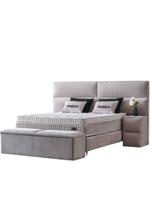 Le lit Mini Puzzle présente un design moderne et épuré, recouvert d’un tissu gris doux. Sa tête de lit capitonnée, aux lignes simples et horizontales, apporte une touche élégante et contemporaine. Il est accompagné d’un matelas confortable, d’une banquette assortie au pied du lit et d’une table de chevet coordonnée, créant un ensemble harmonieux, pratique et chaleureux.