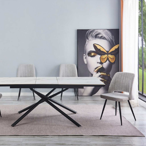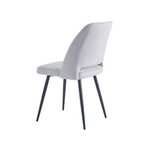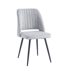 La chaise Tom présente un design contemporain et épuré. Elle est dotée d’une assise et d’un dossier rembourrés, habillés d’un tissu gris clair avec des surpiqûres verticales, et repose sur quatre pieds fins en métal noir, offrant un ensemble à la fois élégant et moderne.