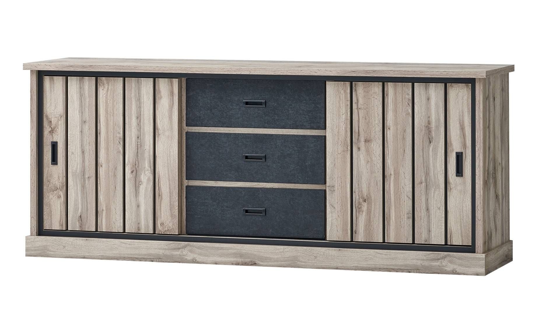 Le buffet Elena 225 cm associe le charme naturel du bois à un design contemporain. Son décor chêne du Canada est sublimé par des accents noirs et des façades de tiroirs effet marbre noir, pour un contraste élégant et raffiné.