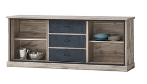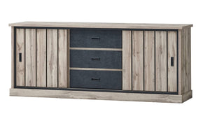 Il comprend deux portes coulissantes sur glissières télescopiques avec poignées encastrées en plastique noir, ainsi que trois larges tiroirs centraux offrant un espace de rangement généreux.