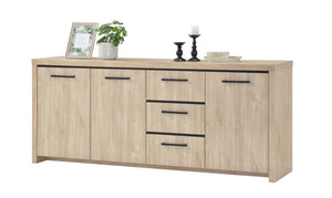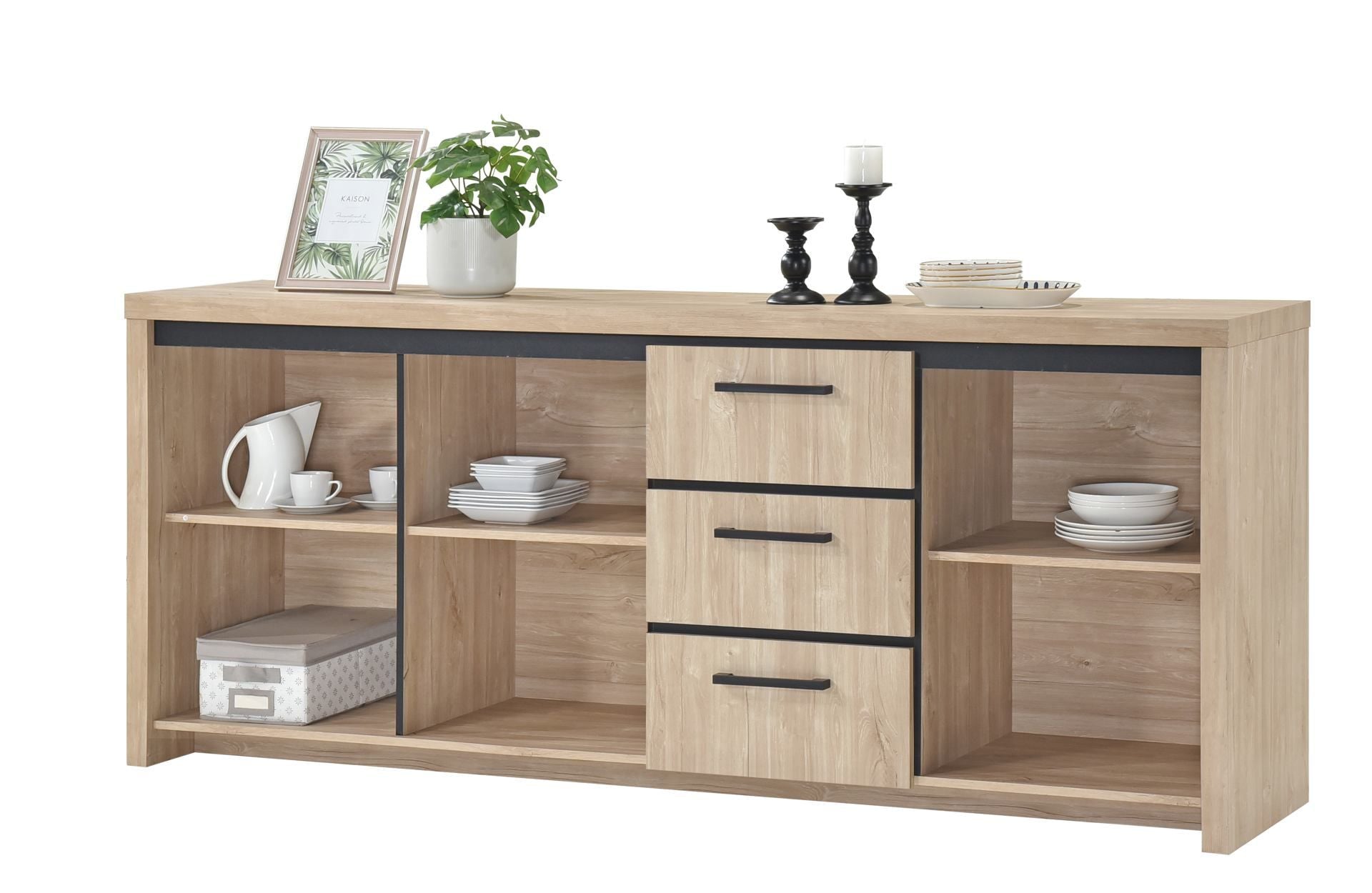 Le buffet Esprit en chêne clair attire tous les regards dans un intérieur moderne. Avec ses dimensions généreuses de 220 cm de large, 90 cm de haut et 45 cm de profondeur, il allie design élégant et grand espace de rangement. Le ton chêne clair chaleureux est rehaussé par une ligne d’accent noire incrustée tout autour, pour une touche contemporaine et raffinée. La façade se distingue par des lignes noires discrètes et de larges poignées en plastique noir, qui complètent son allure épurée. Ce meuble se compose de trois portes spacieuses et de trois tiroirs pratiques, montés sur des coulisses métalliques pour une ouverture fluide. Le dessus et les côtés sont réalisés en panneau alvéolaire de 6 cm d’épaisseur, garantissant une apparence robuste et de haute qualité. Le buffet Esprit est le choix idéal pour ceux qui recherchent un meuble aussi fonctionnel qu’esthétique.