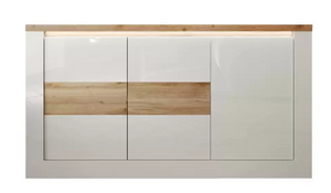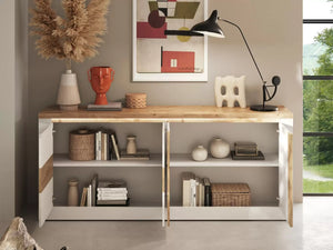 Le dressoir Ishia 4 portes séduit par son design épuré et moderne, mariant avec élégance la pureté du blanc laqué à la chaleur du chêne naturel, pour un rendu à la fois lumineux et raffiné qui sublimera votre espace de vie.
