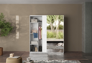 cette armoire offre un espace de rangement abondant pour tous vos vêtements et accessoires. Les portes coulissantes facilitent l’accès à vos affaires tout en économisant de l’espace, et le miroir ajoute une touche de praticité à votre routine matinale.