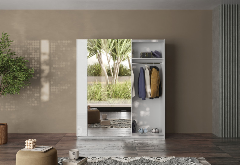 Armoire à Portes Coulissantes avec Miroir : L’élément central de la chambre. est l’armoire à portes coulissantes avec un miroir intégré.