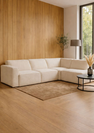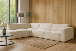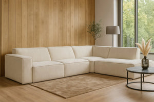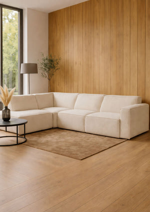 Apportez une touche de chaleur contemporaine à votre intérieur avec le canapé d’angle Orlando. Son revêtement en tissu bouclé beige clair lui donne un aspect doux et élégant, parfait pour créer une ambiance cosy et minimaliste. Ce canapé modulable se distingue par ses formes généreuses, ses accoudoirs épais et son assise profonde, idéale pour se détendre en famille ou entre amis.