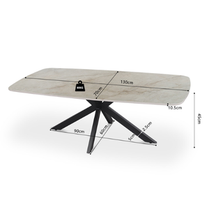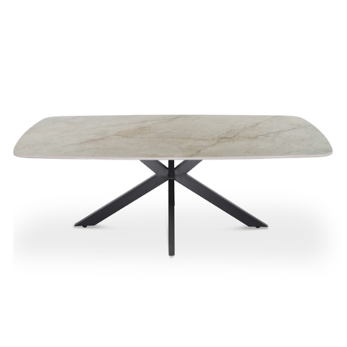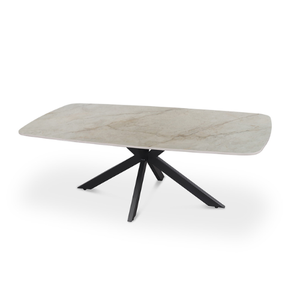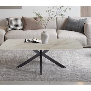 La table basse Apollo séduit par son plateau rectangulaire aux bords adoucis, affichant une élégante teinte pierre claire qui rappelle le marbre. Elle repose sur un pied central en étoile, en métal noir, offrant à la fois stabilité et un style résolument moderne. Un modèle chic et épuré qui apporte une touche sophistiquée à tout salon.