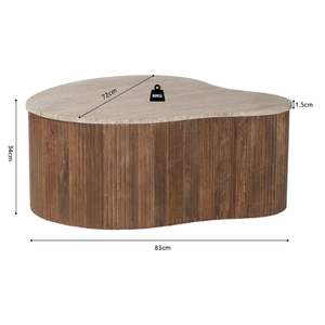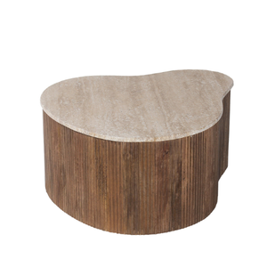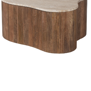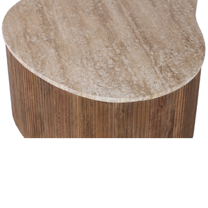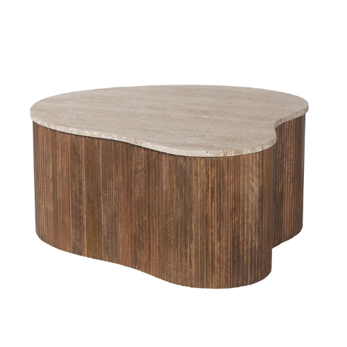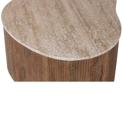 Son plateau effet pierre claire contraste élégamment avec une base en bois strié à l’aspect naturel.
