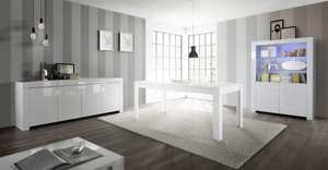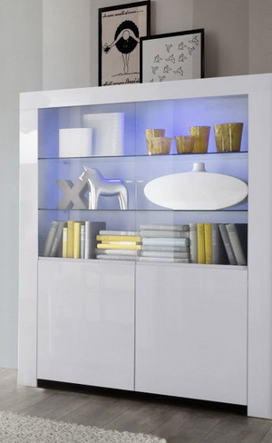 La vitrine Amalfi combine modernité et élégance. Son effet laqué brillant et son éclairage LED apportent une touche de luxe discret, idéale pour sublimer un salon contemporain.