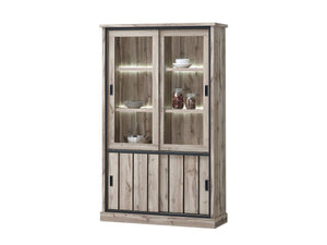 La vitrine comprend deux portes vitrées coulissantes montées sur glissières télescopiques. Derrière ces panneaux se trouvent deux tablettes en bois avec éclairage LED indirect, parfait pour mettre en valeur votre vaisselle ou vos objets décoratifs.