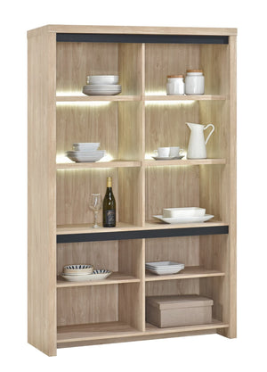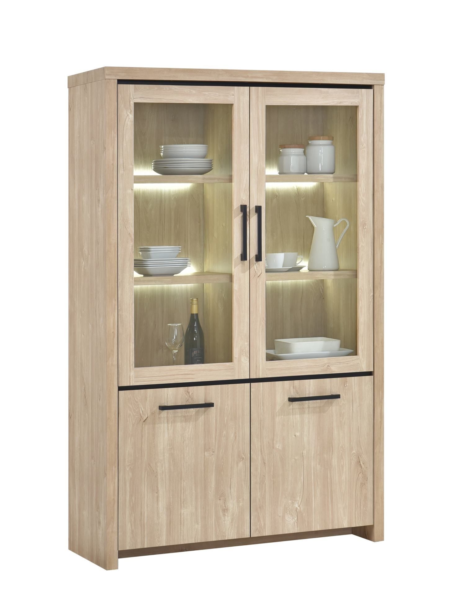 Cette vitrine de la collection Esprit associe fonctionnalité et élégance dans un meuble au style raffiné. Finition en chêne clair avec de subtils accents noirs, elle s’harmonise parfaitement avec les autres meubles de la même gamme. Avec ses dimensions de 121 cm de large, 190 cm de haut et 46 cm de profondeur, elle offre un espace de rangement à la fois ouvert et fermé. Les deux portes vitrées mettent en valeur votre vaisselle ou vos objets décoratifs, magnifiés par un éclairage LED intégré. Quatre tablettes solides se trouvent derrière les vitres, séparées par une paroi verticale pour une stabilité renforcée. En bas, deux portes pleines dissimulent un espace de rangement supplémentaire avec une étagère pratique. L’aspect bois, les accents noirs et la lumière intégrée confèrent à cette vitrine un caractère moderne et élégant.